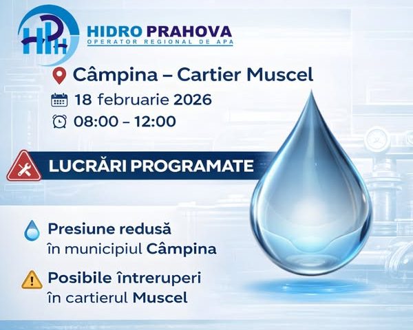 HIDRO PRAHOVA S.A. informează că în data de 18 februarie 2026, în intervalul orar 08:00 – 12:00, vor avea loc lucrări programate pentru cuplarea instalațiilor hidromecanice aferente camerei de vane – Rezervor 2 GA Muscel.