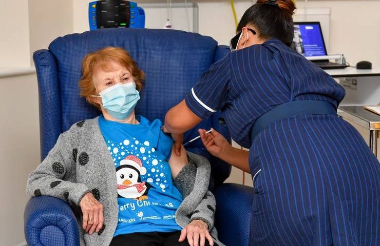 Margaret Keenan, care locuiește în Coventry, dar este originară din Eniniskillen, Irlanda de Nord, a fost vaccinată de către asistenta medicală May Parsons la Spitalul Universitar al orașului la 6.31am.